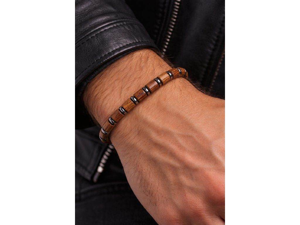 Dřevěné korálky o velikosti 0,7 cm zaujmou svou přirozenou strukturou a teplým odstínem, zatímco lesklé prvky z hematitu dodávají náramku luxusní kontrast a jemný kovový lesk. Výsledkem je harmonická kombinace, která se hodí jak k elegantnímu outfitu, tak i k běžnému nošení.