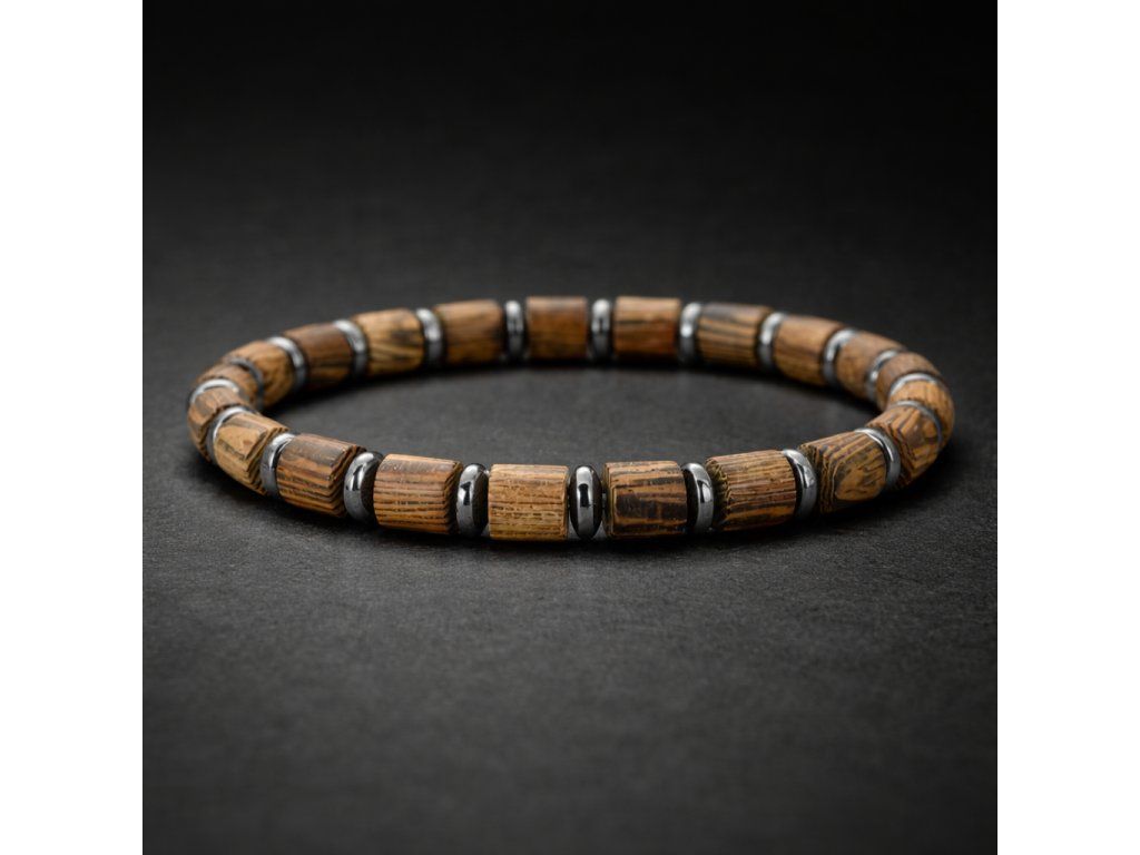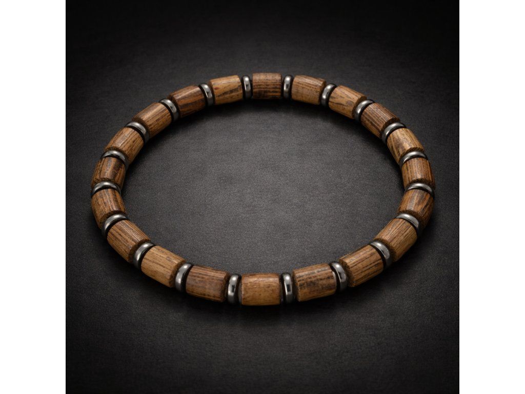 Elegantní ručně vyráběný náramek z přírodního dřeva a hematitu, který spojuje minimalistický design s nadčasovou mužností. Ideální doplněk pro každodenní nošení i jako stylový dárek pro partnera.