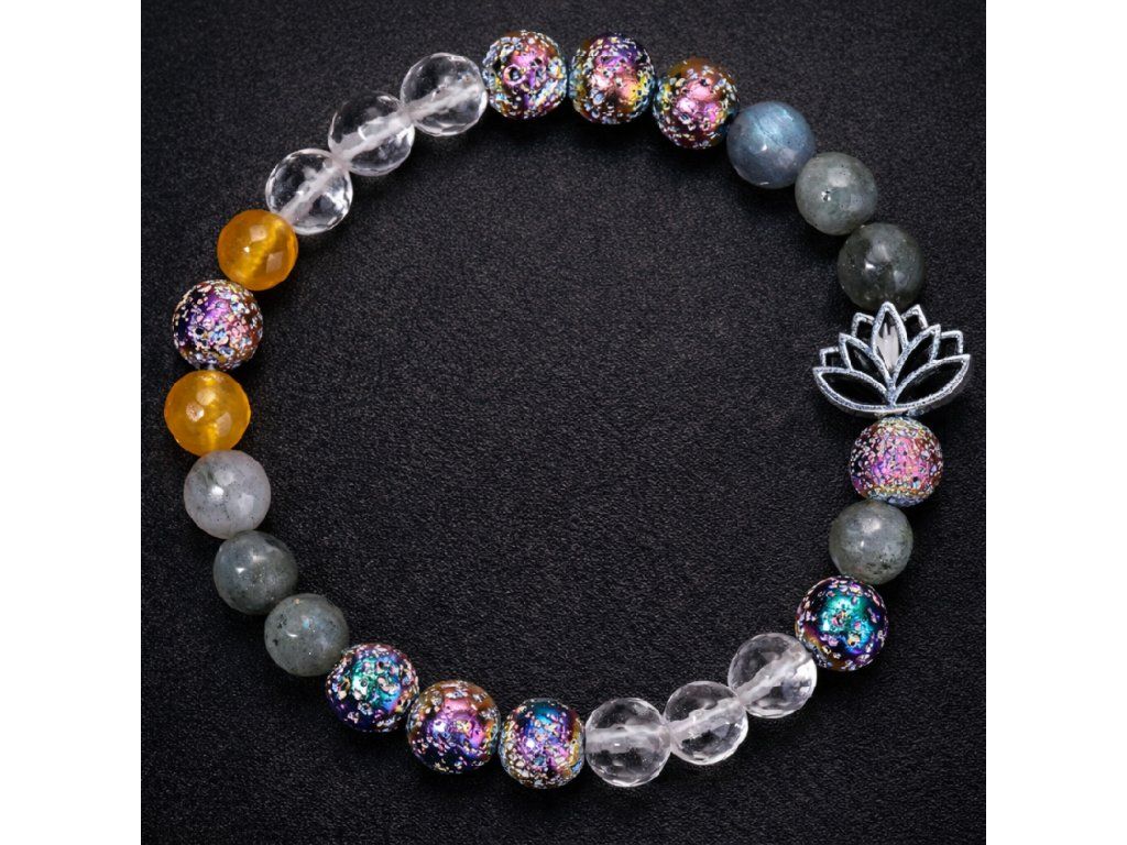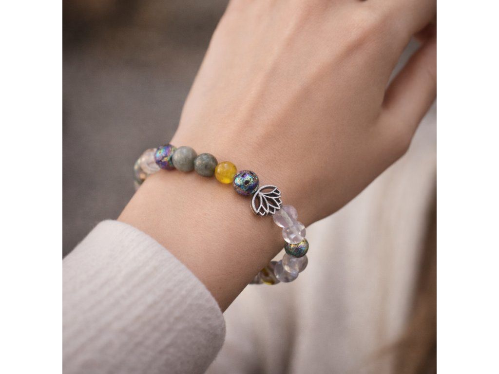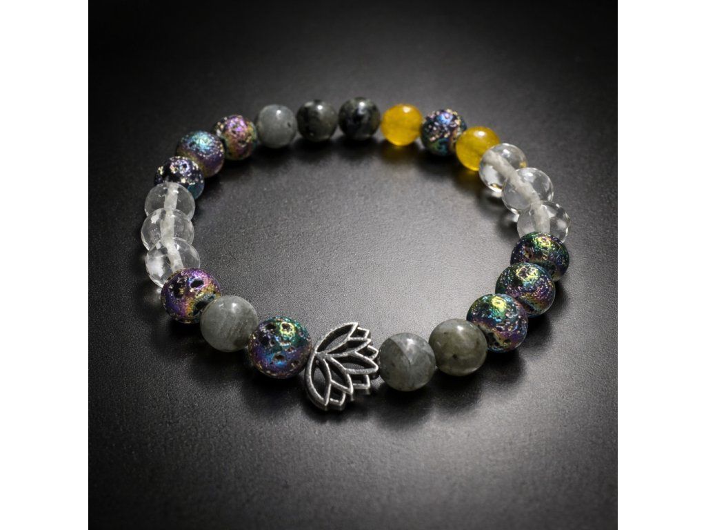 Elegantní ručně vyráběný minerální náramek s průměrem korálků 8 mm kombinuje sílu přírodních kamenů labradoritu, křišťálu, citrínu a duhového lávového kamene. Dominantou náramku je přívěsek lotosu ze slitiny zinku, symbolizující harmonii, čistotu a nový začátek. Univerzální velikost 18–21 cm zajišťuje pohodlné nošení na každý den i při speciálních příležitostech.