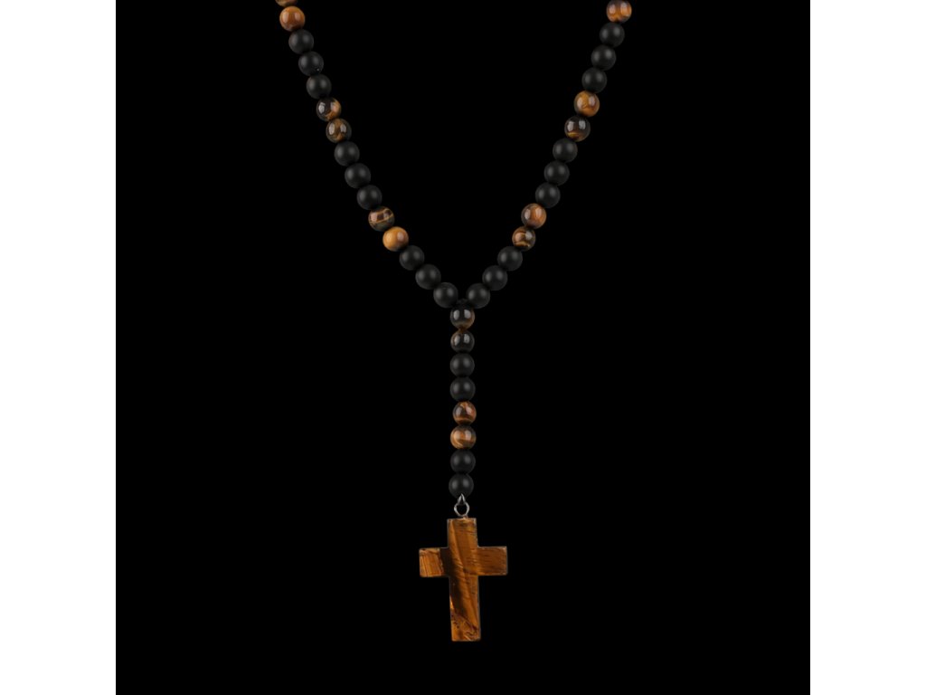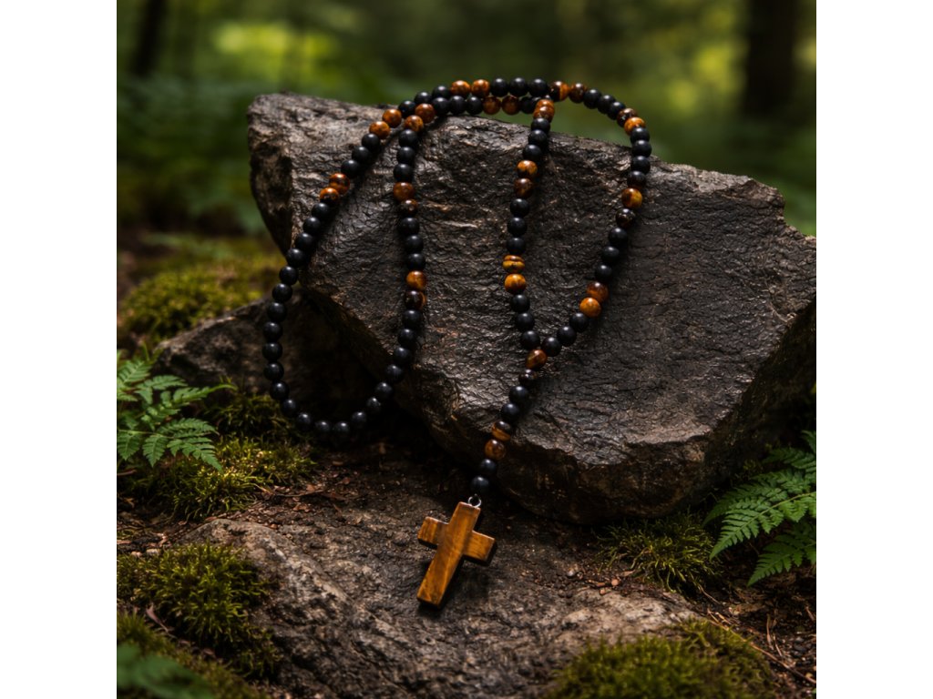 Pánský náhrdelník z přírodního onyxu, tygřího oka a dřeva představuje vyvážené spojení klidu, stability a mužské energie. Matný onyx působí čistě a sebejistě, zatímco tygří oko přidává hloubku a přirozený lesk. Dominantní dřevěný kříž pak celek uzavírá – výrazný, ale neokázalý. Šperk, který nevyžaduje pozornost, a přesto ji přitahuje.