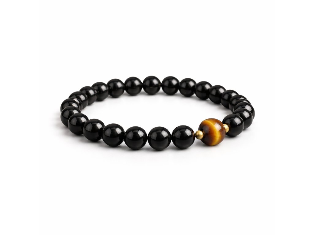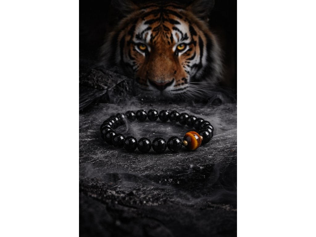 Obsidián je přírodní vulkanické sklo s hlubokým, lesklým černým povrchem, který dodává náramku minimalistický a elegantní vzhled. Tygří oko ve zlatohnědých tónech přitahuje pozornost a stává se přirozeným středobodem šperku, aniž by působilo rušivě.