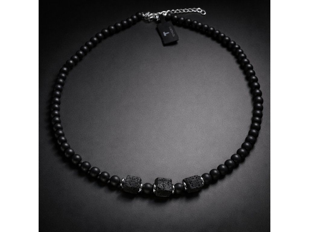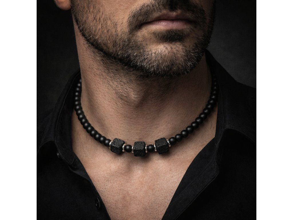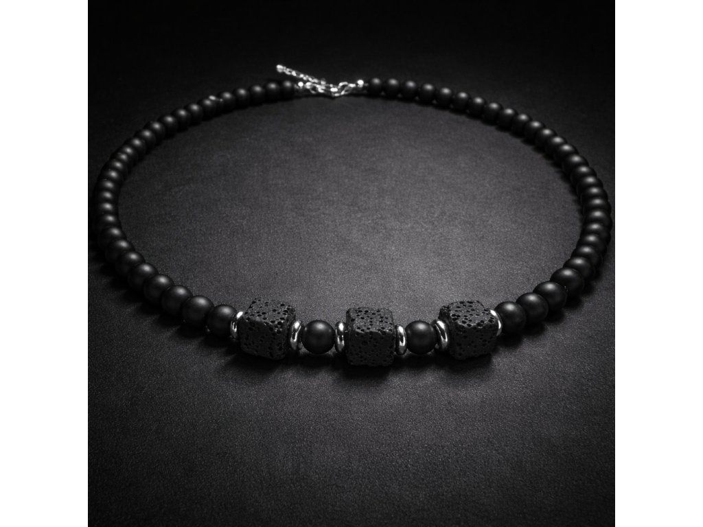Elegantní pánský náhrdelník z matných kamenných korálků se třemi výraznými vulkanickými kameny o velikosti 8 × 8 mm , které jsou symbolem síly, stylu a mužské elegance. Ručně vyráběný šperk doplňují tři dominantní lávové kameny a detaily z kvalitní nerezové oceli. Nadčasový doplněk, který podtrhne osobnost každého muže – ideální také jako stylový dárek pro partnera.