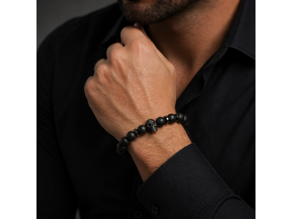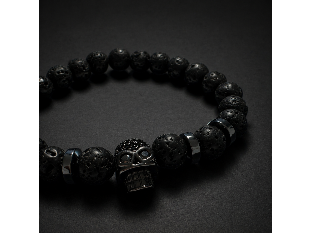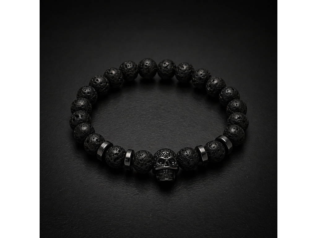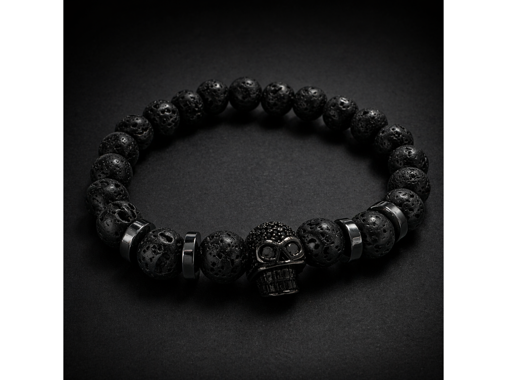 Objevte jedinečný pánský náramek z lávových kamenů a hematitu, který spojuje přírodní sílu minerálů s moderním designem. Dominantním prvkem je detailně zpracovaná lebka z kvalitní nerezové oceli, která dodává náramku charakter a osobitý styl.