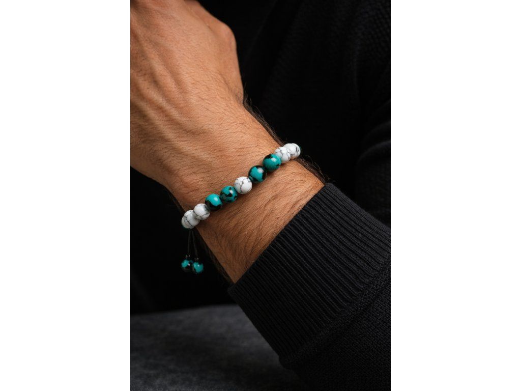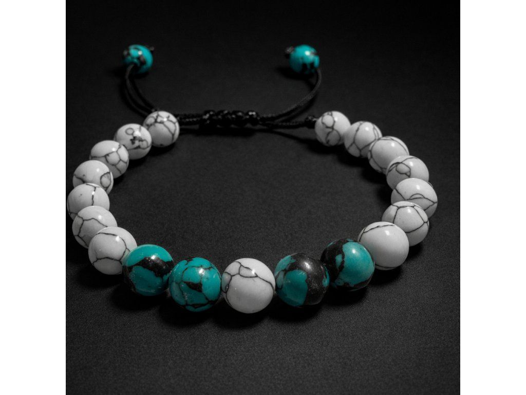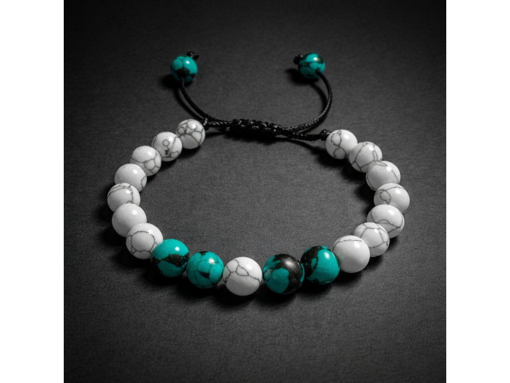 Elegantní ručně vyráběný náramek z přírodních kamenů tyrkysu a howlitu spojuje styl, energii a osobitost. Díky nastavitelné velikosti perfektně padne na každé zápěstí a stane se ideálním dárkem pro vašeho partnera.
