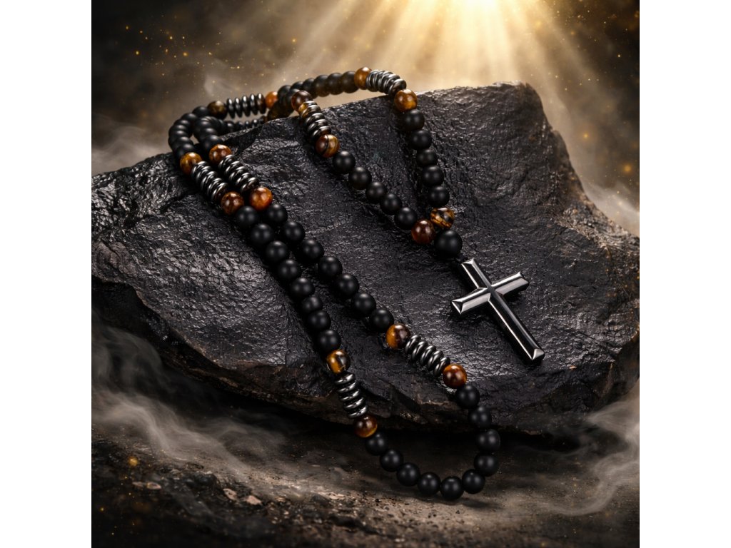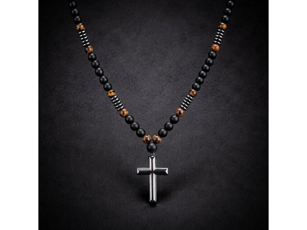 Luxusní pánský korálkový náhrdelník z 8mm černého obsidiánu a tygřího oka, doplněný hematitovým přívěskem ve tvaru kříže. Nadčasový symbol síly, ochrany a stylu.