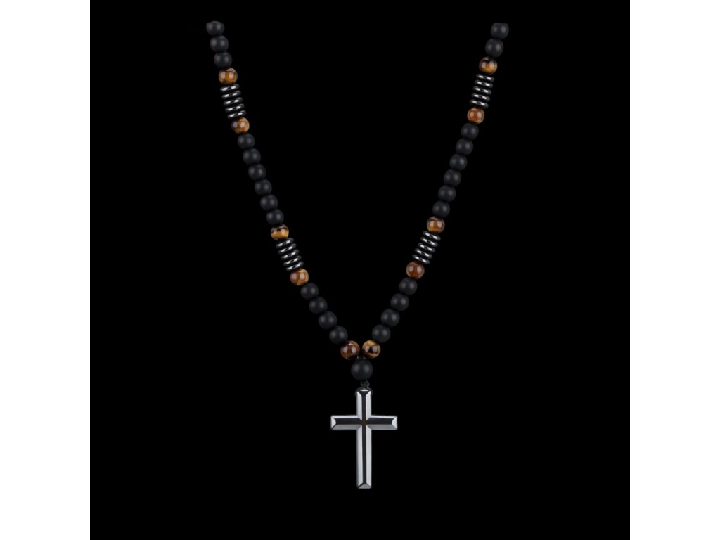 Náhrdelník z černého obsidiánu a tygřího oka s hematitovým křížem