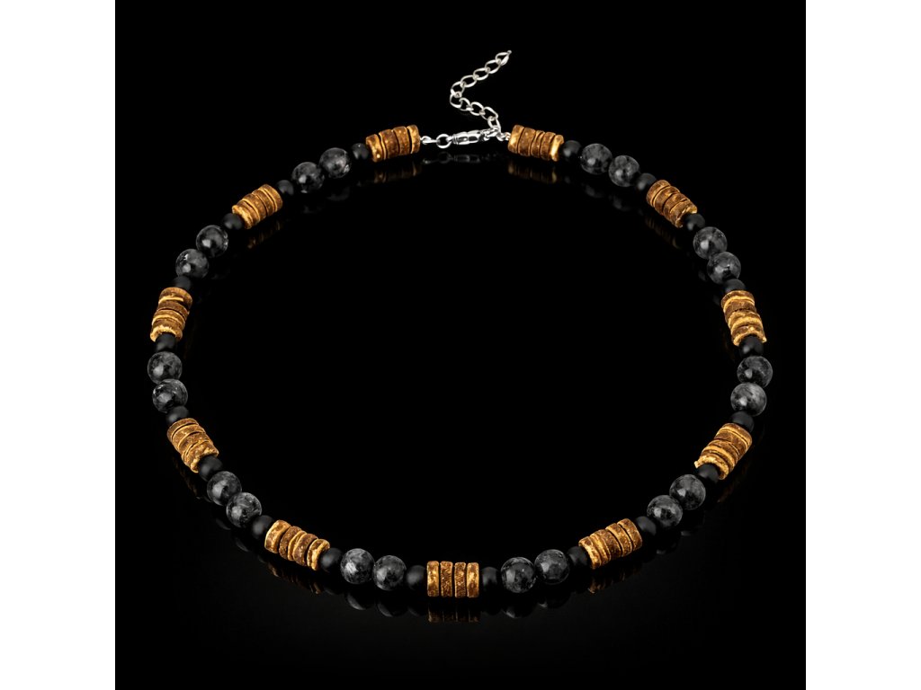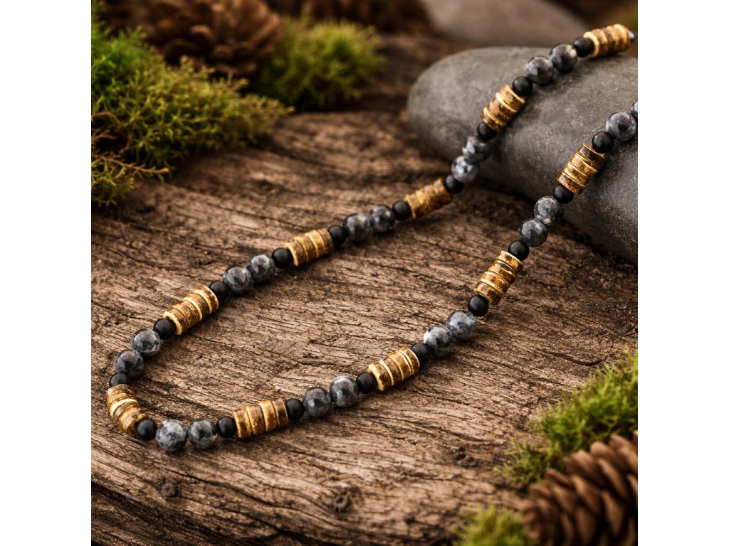 Objevte nadčasový pánský náhrdelník, který zaujme svou jedinečnou kombinací přírodních materiálů a precizního ručního zpracování. Tento exkluzivní šperk je vytvořen z vysoce kvalitního labradoritu, doplněného o kokosové dřevo a elegantní černé korálky, které společně tvoří harmonický a mužný design.