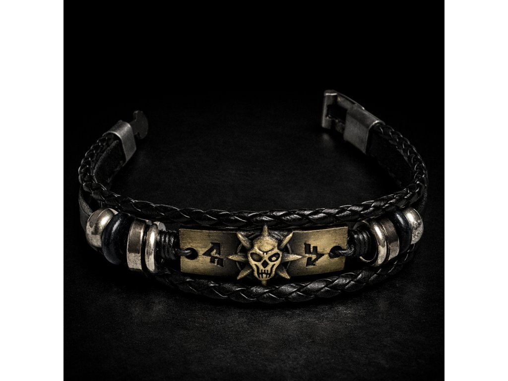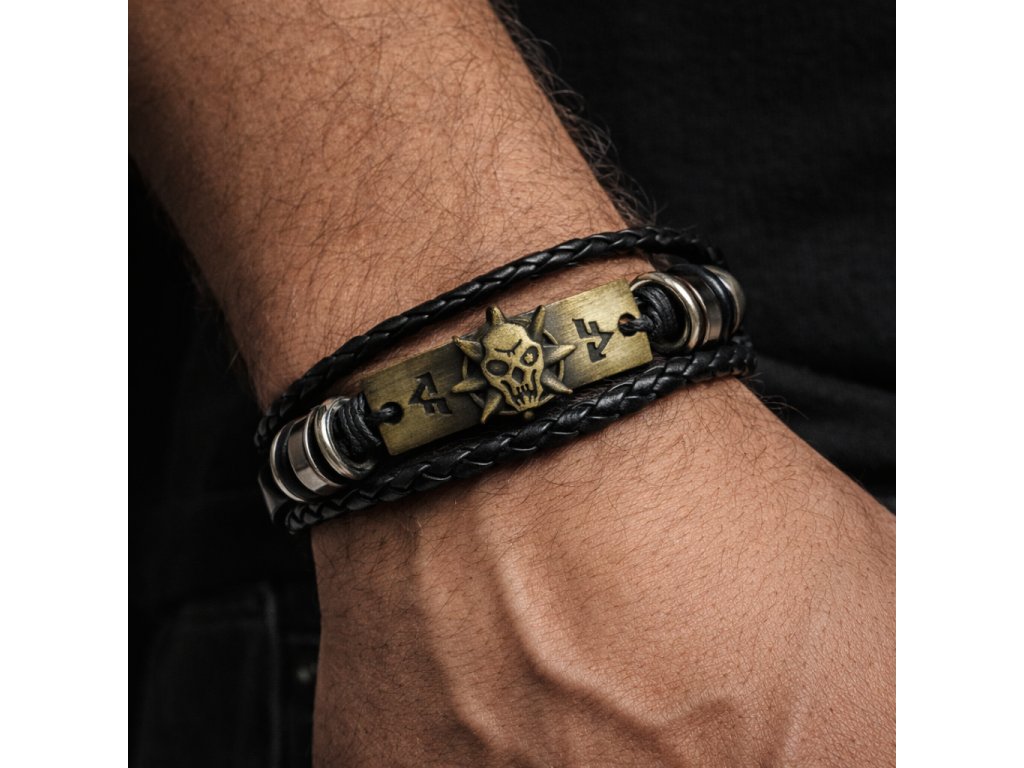 Stylový pánský kožený náramek s výrazným kovovým motivem lebky a runovými symboly. Kombinace černé pletené kůže a bronzového detailu vytváří drsný, ale luxusní doplněk pro muže, kteří chtějí vyniknout.