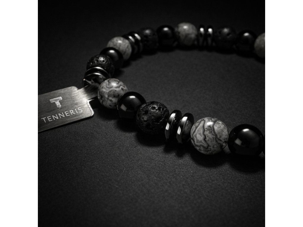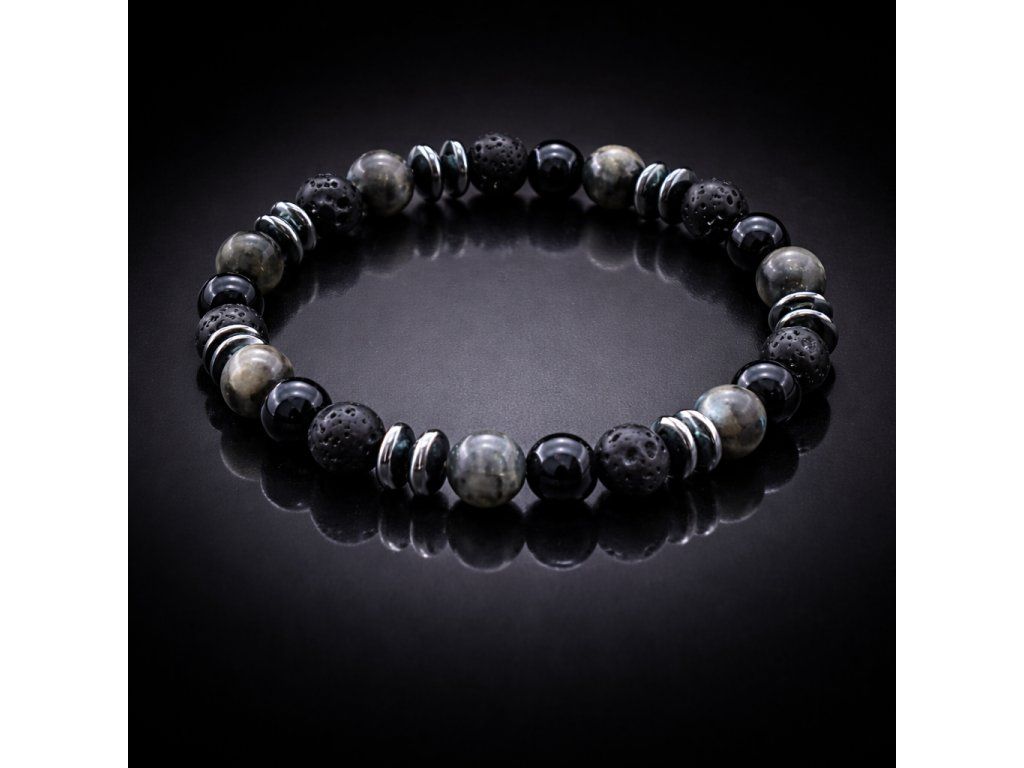 Design náramku je postaven na kombinaci korálů o velikostech 6 mm, 8 mm a 10 mm, což zajišťuje vyvážený a luxusní vzhled. Délka 21 cm odpovídá standardnímu pánskému zápěstí a elastické provedení bez zapínání zaručuje pohodlné každodenní nošení.