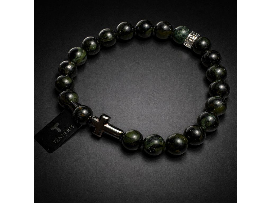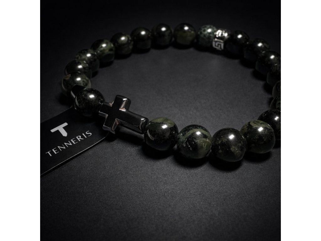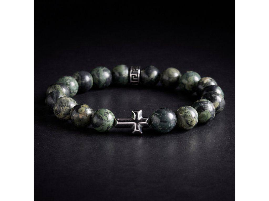 Pánský náramek z přírodního kambaba jaspisu s ocelovým křížem o průměru korálků 8mm je symbolem síly, klidu a vnitřní rovnováhy. Ručně sestavený doplněk pro muže, kteří chtějí vyjádřit charakter, víru a styl v jednom nadčasovém šperku.