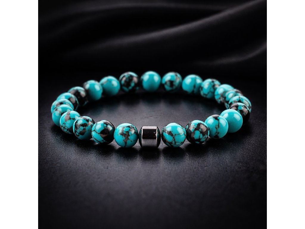 Elegantní náramek z tyrkysových kamenů s výraznou kresbou a minimalistickým kovovým detailem. Stylový doplněk pro každodenní nošení i jako originální dárek.