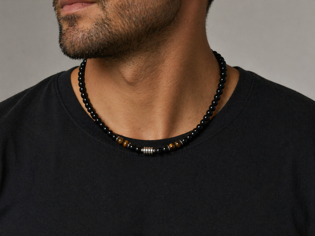 Objevte sílu přírodních kamenů v podobě jedinečného pánského náhrdelníku, který kombinuje hluboký lesk obsidiánu a charakteristické zlatavé odlesky tygřího oka. Každý kus je ručně vyráběný, což zaručuje originalitu a důraz na detail.