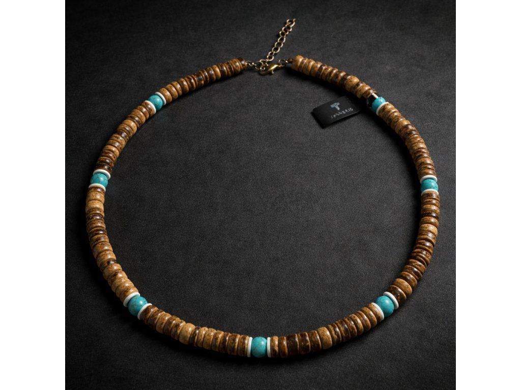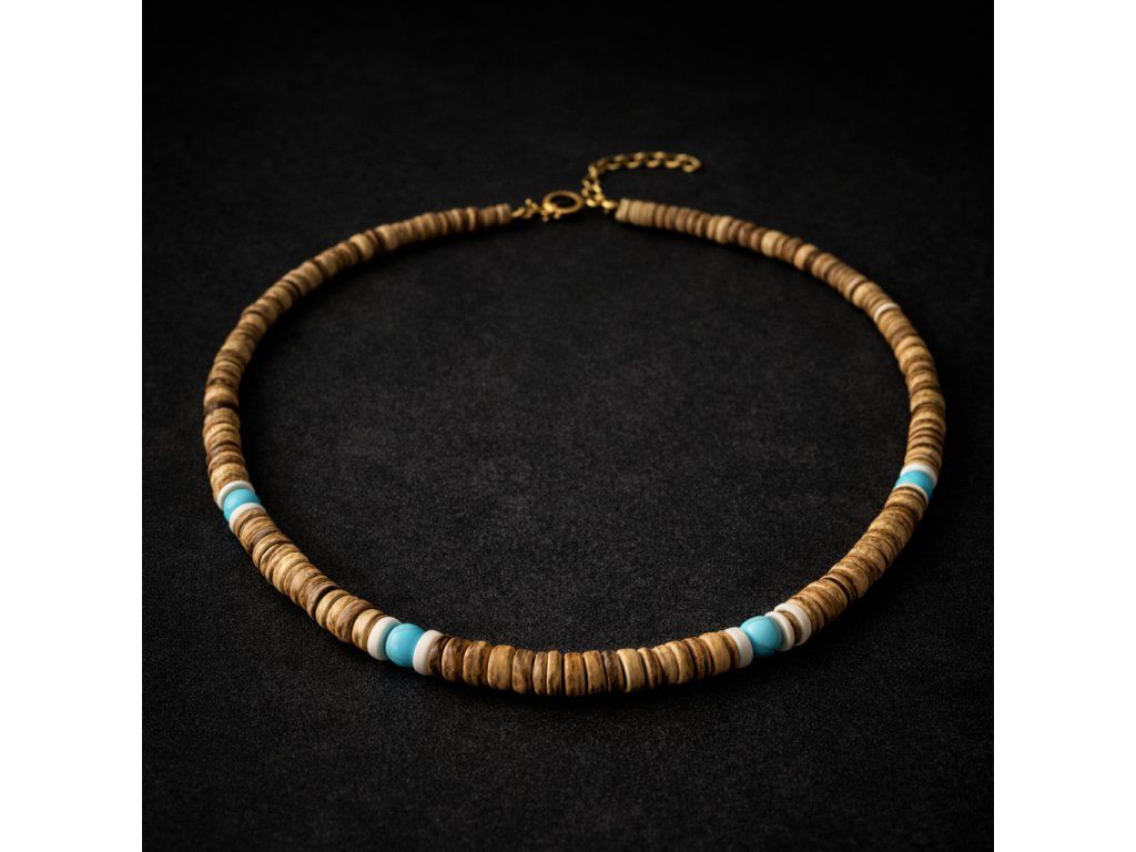 Ručně vyráběný pánský náhrdelník z přírodních heishi korálků doplněný tyrkysovými akcenty o průměru 8 mm. Minimalistický, nadčasový a inspirovaný přírodou – ideální doplněk pro každodenní nošení i letní styl.