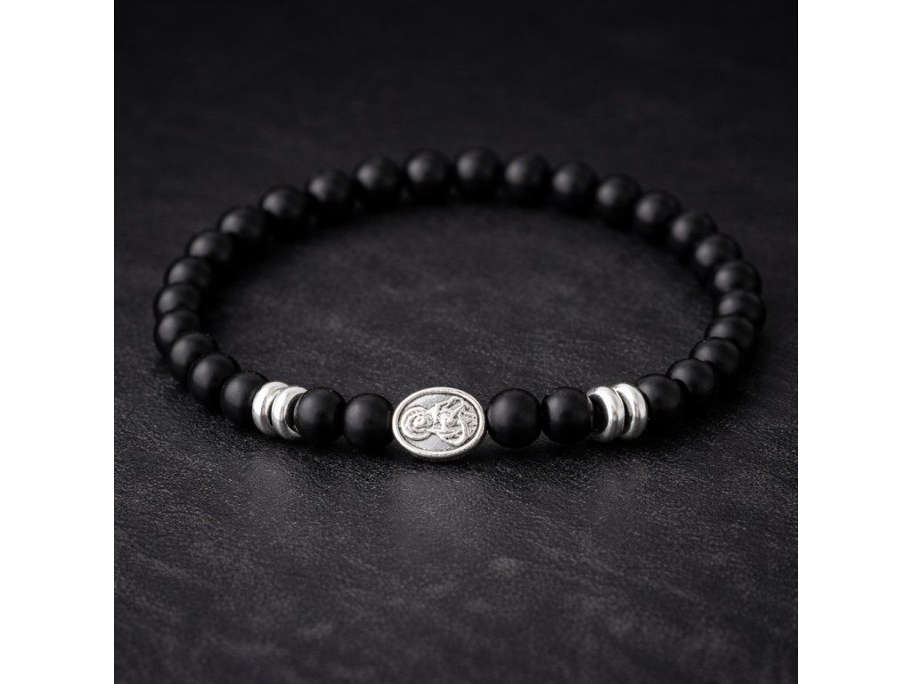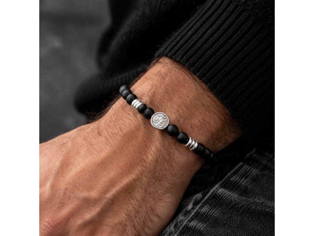 Elegantní ručně vyráběný náramek z přírodního onyxu a hematitu doplněný dvěma symboly síly a víry. Minimalistický design, který podtrhne mužský styl a zároveň nese hlubší význam. Ideální dárek pro partnera.