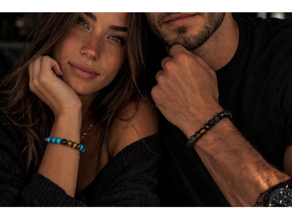 Luxusní párové náramky z přírodních kamenů představují stylový symbol spojení, harmonie a síly. Kombinace tyrkenitu, lávového kamene a tygřího oka vytváří elegantní kontrast barev a energií, který vynikne na každém zápěstí. Korálky o průměru 8 mm doplňuje pevná polyesterová šňůrka s posuvným macramé uzlem, díky které lze velikost snadno upravit v rozmezí 17–27 cm. Ideální šperk pro páry, přátele nebo jako originální dárek s hlubším významem.