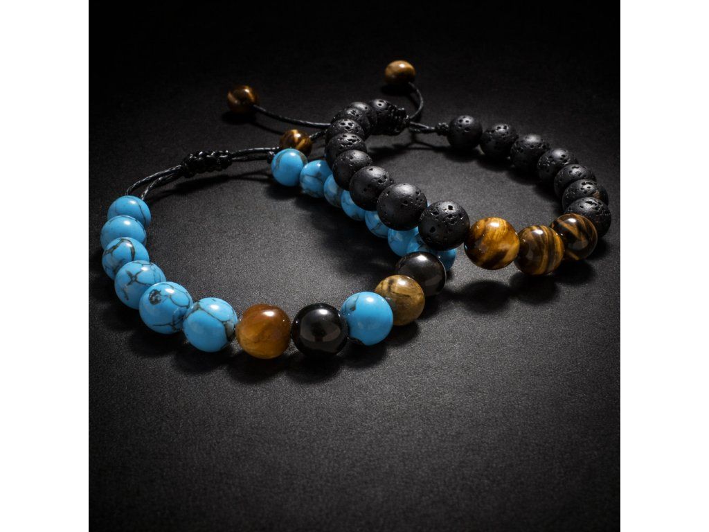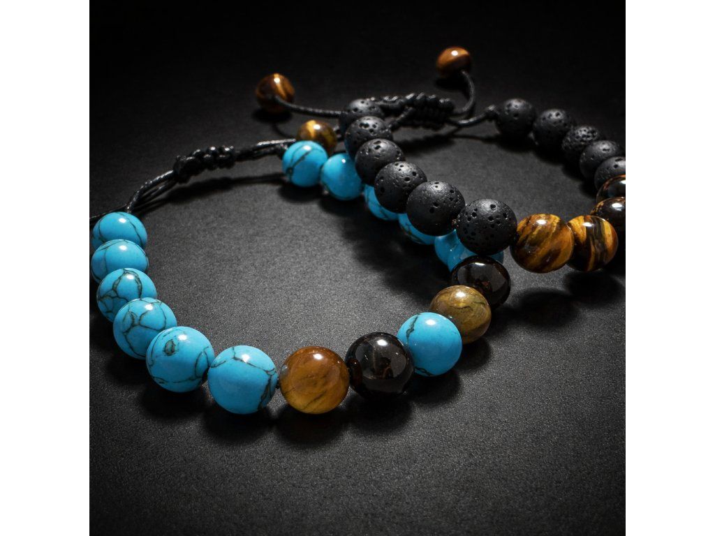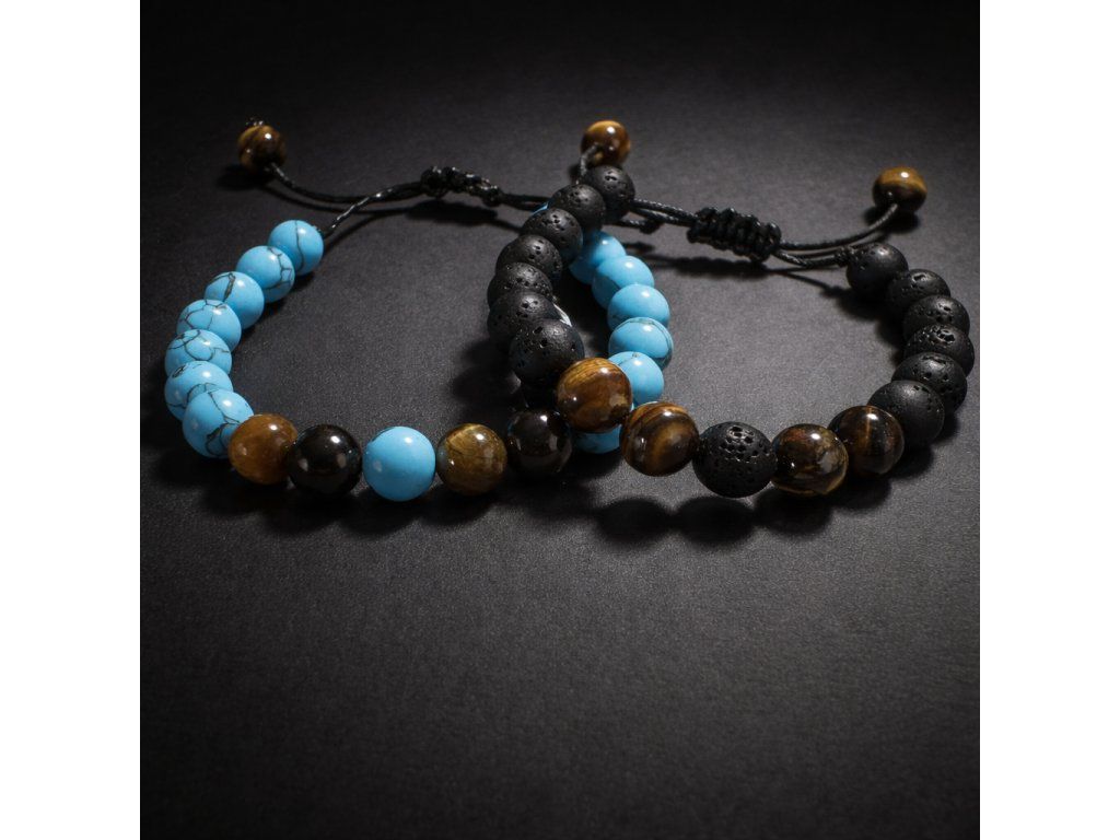 Luxusní párové náramky z přírodních kamenů – Tyrkenit, Lávový kámen a Tygří oko